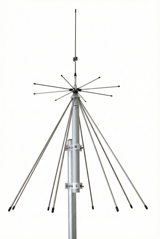 Wide-band discone antenna working on 100-2000 MHz in reception and on many amateur frequencies in transmission (2m, 1 1/4m, 70cm, 33cm, 23cm). It is made of stainless steel, chromed brass and anodized aluminium to guarantee the best efficiency and performance.